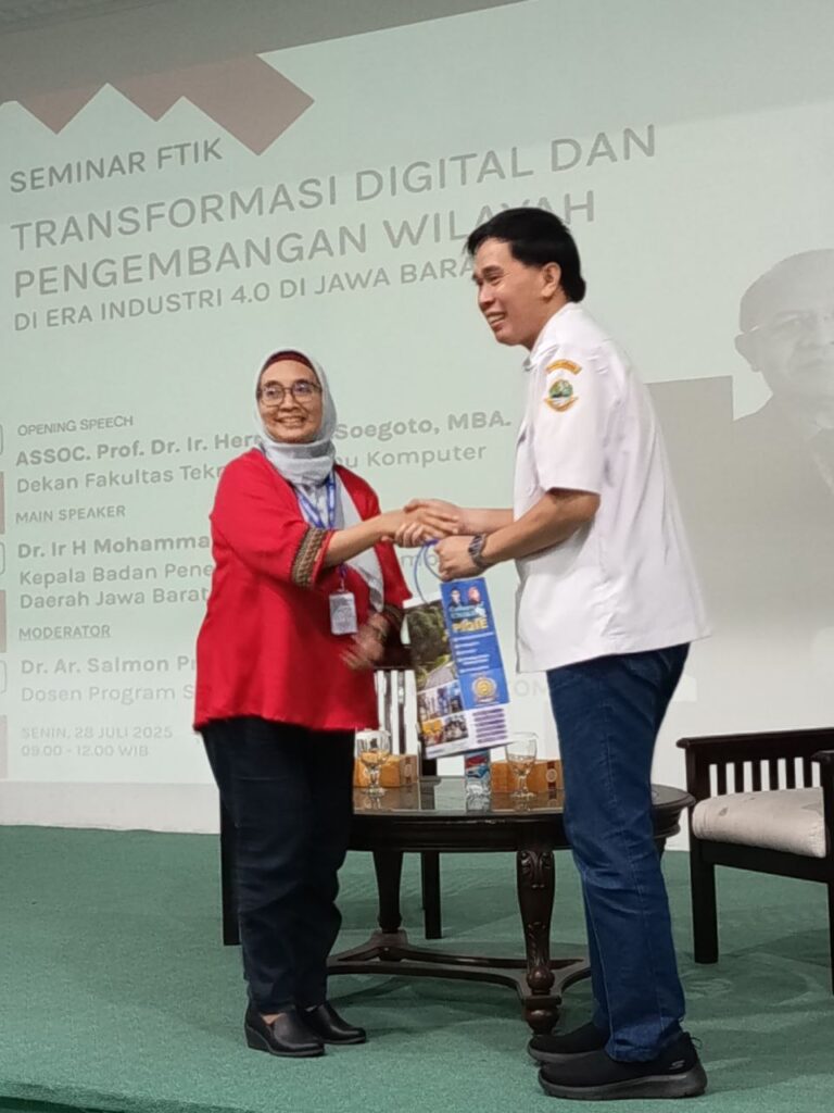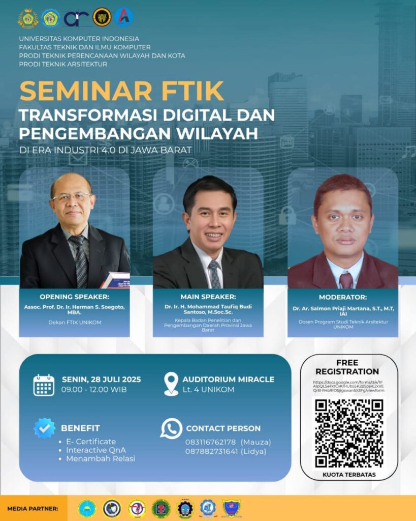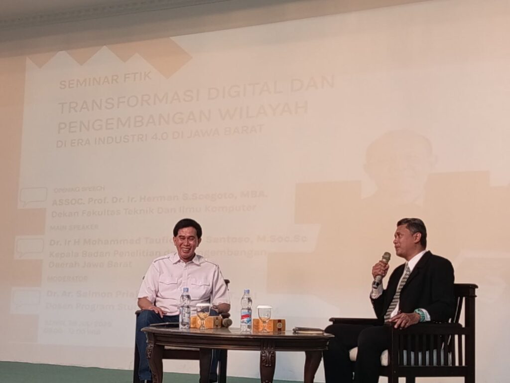 Pada Hari Senin, 28 Juli 2025, jam 09.00 – 12.00 WIB telah dilaksanakan Seminar Fakultas Teknik dan Ilmu Komputer. Kegiatan ini dilaksanakan sebagai kegiatan rutin bulanan Fakultas Teknik dan Ilmu Komputer. Dan pada acara ini Prodi Arsitektur dan Prodi Perencanaan Wilayah Kota sebagai tuan rumah yang menyelenggarakan Seminar ini. Pembicara pada Seminar kali ini adalah Kepala Badan Peneliti dan Pengembangan Daerah Provinsi Jawa Barat, Dr. Ir. H. Mohammad Taufik Budi Santoso, M.Soc.Sc. Peserta Seminar berasal dari seluruh Mahasiswa/i Prodi di lingkungan Fakultas Teknik dan Ilmu Komputer.