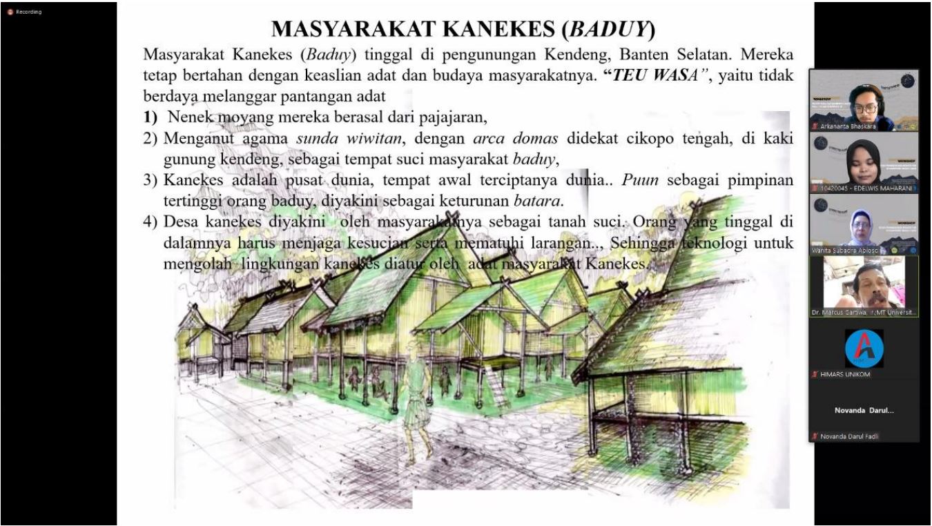 Dalam pemaparan materi oleh Dr. Ir. Marcus Gartiwa, M.T. dijelaskan jika Kampung Baduy ini masih menjaga kelestarian adat istiadatnya dan lingkungan alamnya, begitu pun arsitektur pada bangunan-bangunannya, dimana dalam membangun suatu bangunan di Kampung Baduy ini masih terikat dengan aturan-aturan adat. Selain itu wilayah Kampung Baduy sendiri memiliki zoning vertikal dari utara hingga selatan, hal ini berdasarkan hirarki area dari yang paling tidak sakral hingga yang paling disakralkan, dimana area utara merupakan dianggap kurang sakral seperti Kampung Baduy Dangka dan Kampung Baduy Luar, sedangkan pada bagian selatan merupakan area yang disakralkan seperti Kampung Baduy Dalam dan Kawasan Hutan Larangan.